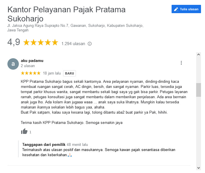 Seorang pengunjung Kantor Pelayanan Pajak (KPP) Pratama Sukoharjo dengan nama akun Aku Padamu menuliskan ulasan di Google Review (Kamis, 13/10). Ulasan dengan bintang lima tersebut menceritakan pengalamannya berkunjung ke KPP Pratama Sukoharjo, Kabupaten Sukoharjo dengan lengkap dan detail.