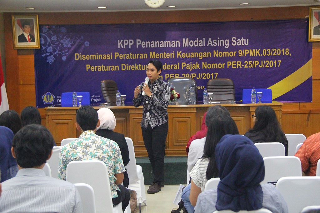 Sehubungan dengan dikeluarkannya tiga peraturan terbaru yaitu PMK-9/PMK.03/2018, PER-25/PJ/2017, dan PER-29/PJ/2017, Kantor Pelayanan Pajak (KPP) Penanaman Modal Asing (PMA) Satu mengadakan sosialisasi kepada Wajib Pajak di Aula KPP PMA Dua-Tiga Kalibata, Jakarta Selatan (Selasa, 24/4). Kegiatan sosialisasi ini mengundang lebih kurang 130 wajib pajak yang terdaftar di KPP PMA Satu dengan domisili usaha sekitar Jabodetabek, Cikarang dan Karawang.