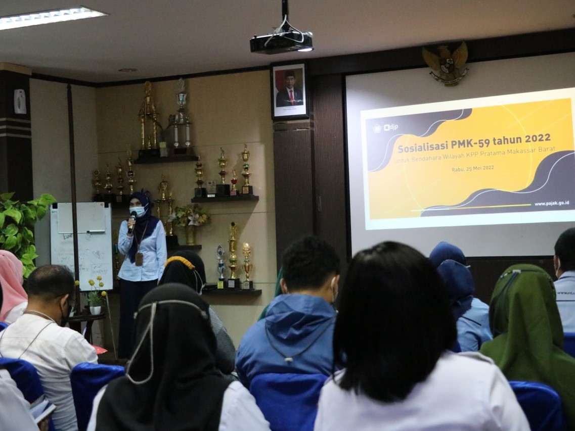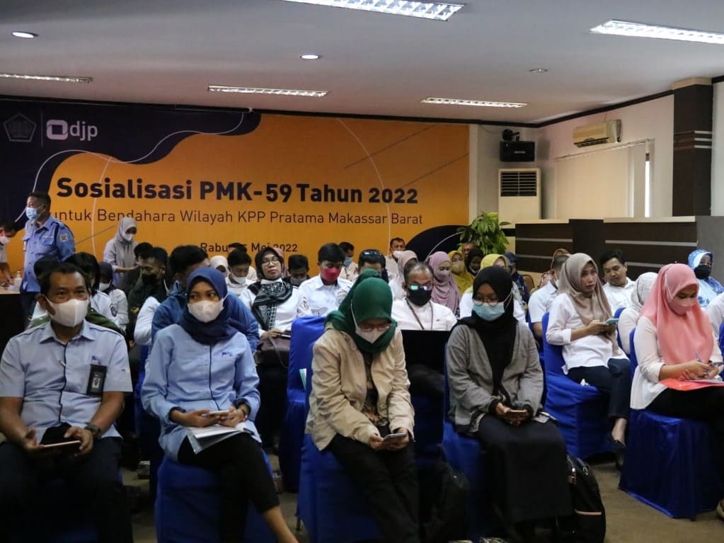 Kantor Pelayanan Pajak (KPP) Pratama Makassar Barat menyelenggarakan kegiatan Sosialisasi PMK-59 Tahun 2022 secara tatap muka di ruang aula KPP Pratama Makassar Barat, Kota Makassar (Rabu, 25/5). Kegiatan ini dihadiri oleh para bendaharawan pemerintah yang berada di wilayah kerja KPP Pratama Makassar Barat..