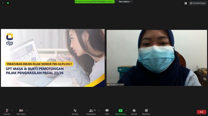 Kantor Pelayanan, Penyuluhan dan Konsultasi Perpajakan (KP2KP) Negara menggelar edukasi daring melalui media Zoom Meeting di Jembrana (Rabu,11/11). Edukasi ini merupakan tindak lanjut dari Peraturan Dirjen Pajak mengenai penggunaan e-Bupot PPh Pasal 23/26 bagi seluruh pemotong mulai 1 September 2020.