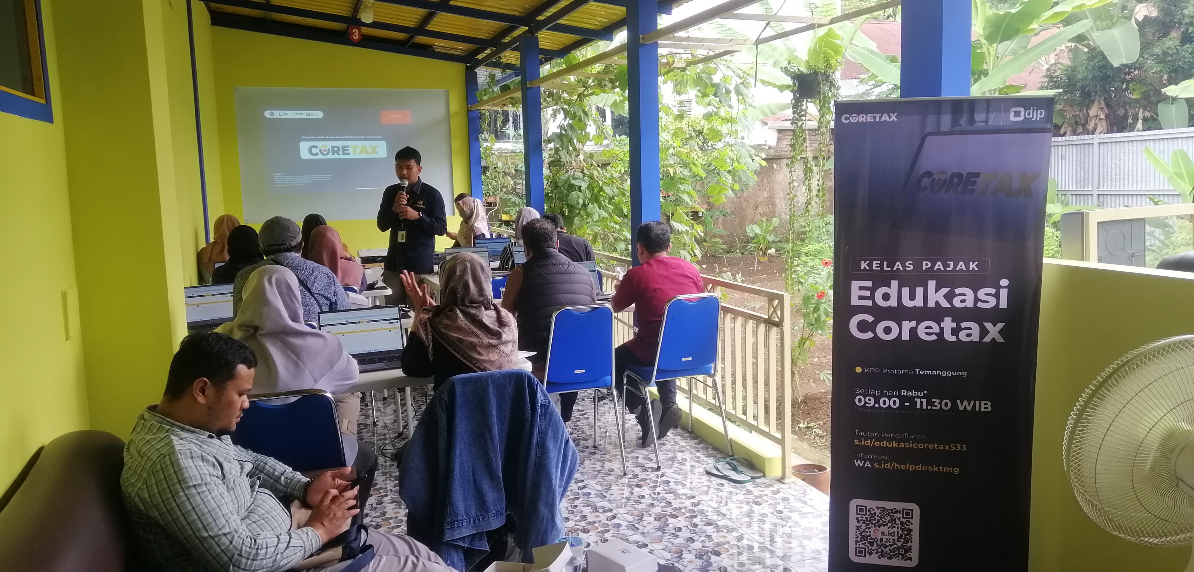 Kantor Pelayanan Pajak (KPP) Pratama Temanggung bersama dengan Kantor Pelayanan, Penyuluhan, dan Konsultasi Perpajakan (KP2KP) Wonosobo menyelenggarakan kegiatan edukasi Coretax di KP2KP Wonosobo, Kab. Wonosobo (Rabu, 20/11). Kegiatan ini diikuti oleh 12 Wajib Pajak Badan yang telah mendaftarkan diri di Kelas Pajak Edukasi Coretax melalui tautan s.id/edukasicoretax533.