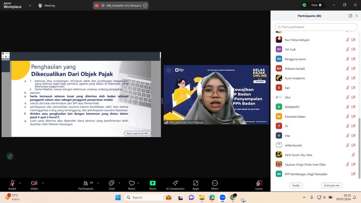 Kantor Pelayanan Pajak (KPP) Pratama Jakarta Kembangan menggelar bimbingan teknis pengisian Surat Pemberitahuan (SPT) Tahunan Badan secara daring melalui aplikasi Zoom Meeting Cloud di Kembangan, Jakarta Barat (Selasa, 9/7). Bimbingan teknis ini dilaksanakan untuk memberikan edukasi pelaporan SPT Tahunan Badan kepada Wajib Pajak Badan di wilayah Kembangan.