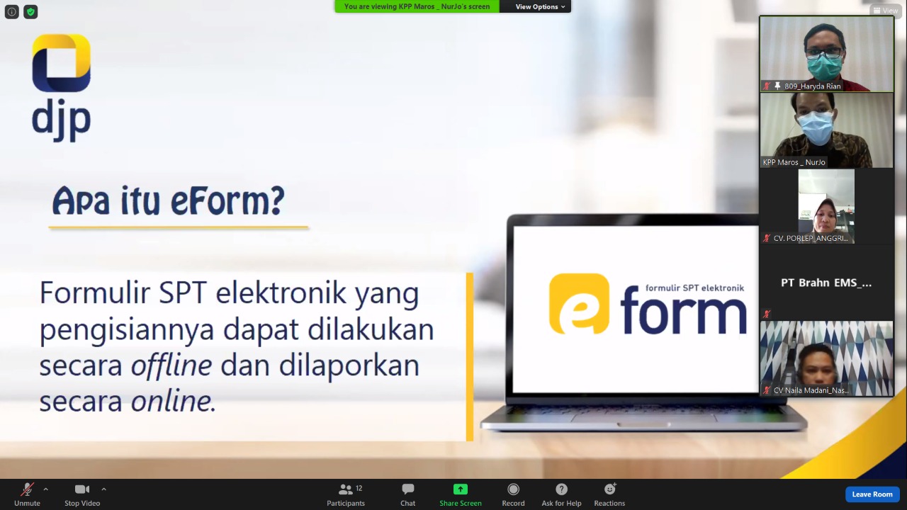 Dari ruang rapat KPP Pratama Maros, Maros, Sulawesi Selatan, Edi Harsono dan Muhammad Nur Joharis selaku Account Representative KPP Pratama Maros menyampaikan materi mengenai tata cara pelaporan SPT Tahunan Badan secara daring. Pemateri juga menjelaskan mengenai dasar pelaporan SPT Tahunan.