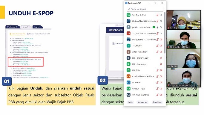 Kantor Pelayanan Pajak (KPP) Pratama Samarinda Ulu bersama KPP Pratama Samarinda Ilir menyelenggarakan acara kelas pajak bertajuk Bimbingan Teknis Pengisian dan Penyampaian Surat Pemberitahuan Objek Pajak Elektronik (e-SPOP) sesuai Peraturan Direktur Jenderal Pajak (Perdirjen) Nomor PER-19/PJ/2019 secara daring melalui Zoom Meetings di Samarinda (Jumat, 9/3).