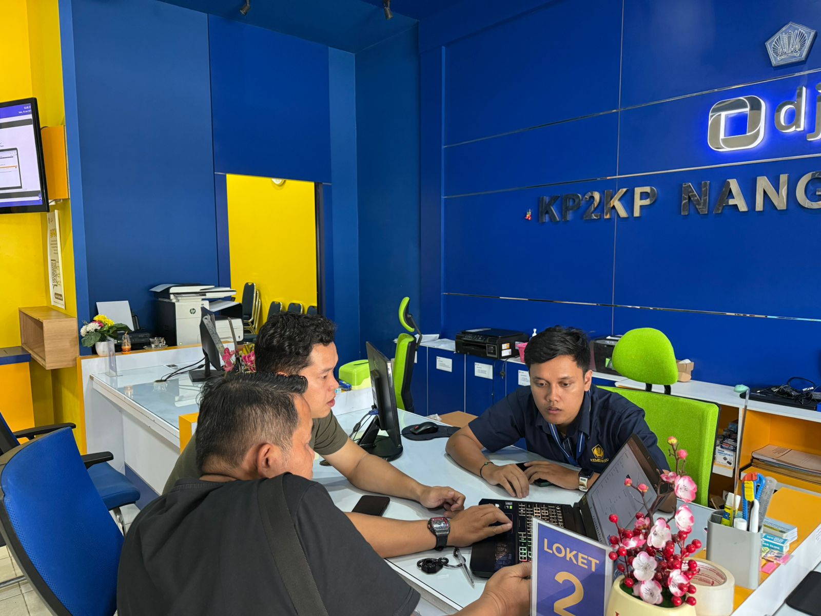Penyuluh Pajak Nanga Pinoh, Abimanyu Krisna, membantu wajib pajak melakukan asistensi pembuatan faktur pajak keluaran bersama salah seorang wajib pajak di Ruang Tempat Pelayanan Terpadu (TPT) KP2KP Nanga Pinoh, Kabupaten Melawi (Rabu, 18/6).
