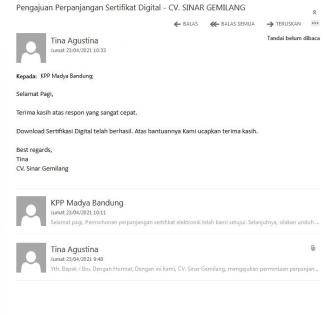 Salah satu pegawai CV Sinar Gemilang, Tina Agustina, memberikan testimoni terkait pelayanan pengajuan perpanjangan sertifikat elektronik (sertel). Menurutnya, petugas yang melayaninya sangat cekatan. “Terima kasih atas respon yang sangat cepat. Download Sertifikat Digital telah berhasil,” ungkap Tina melalui surat elektronik yang diterima KPP Madya Bandung, di Bandung (Jumat, 23/4).