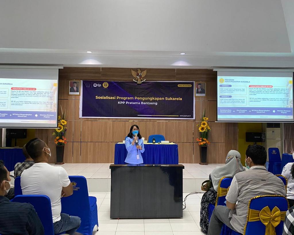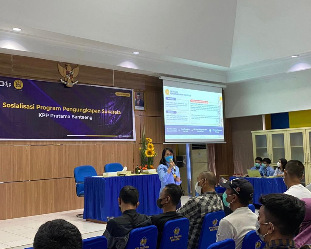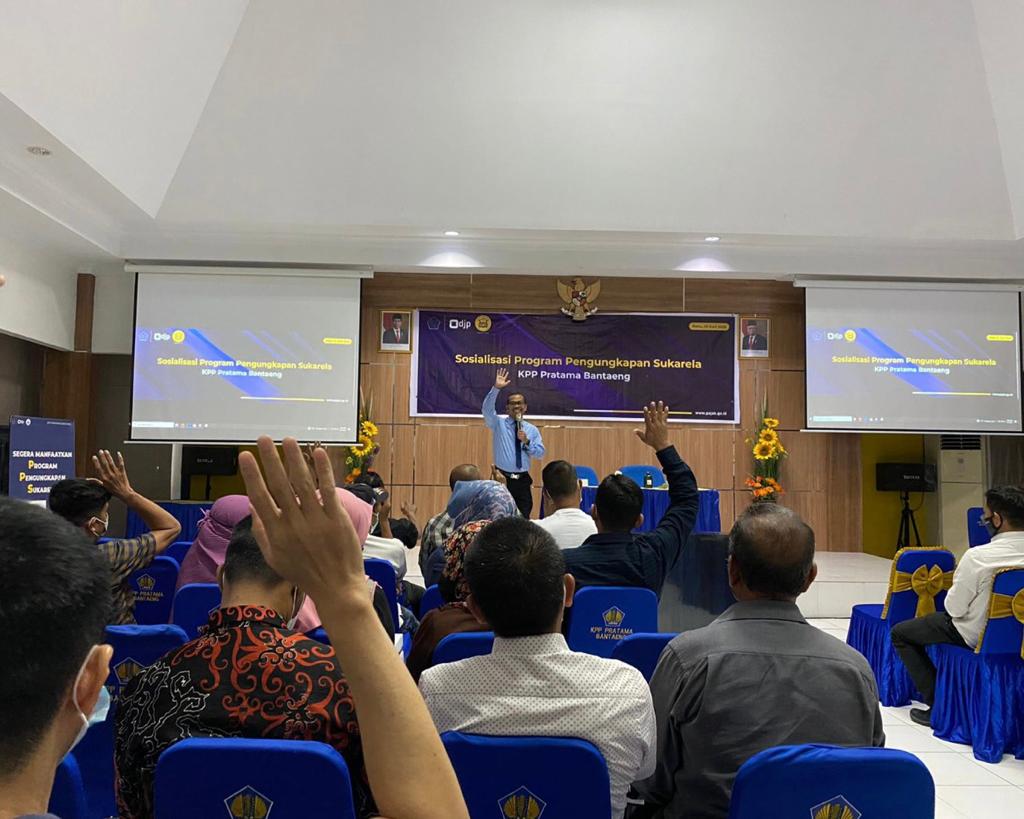 Kantor Pelayanan Pajak (KPP) Pratama Bantaeng mengadakan Sosialisasi Program Pengungkapan Sukarela (PPS) di Aula KPP Pratama Bantaeng, Kabupaten Bantaeng, Sulawesi Selatan (Rabu, 15/6). Sosialisasi ini diikuti oleh 75 wajib pajak prominen dengan pembayaran pajak tertinggi di KPP Pratama Bantaeng.