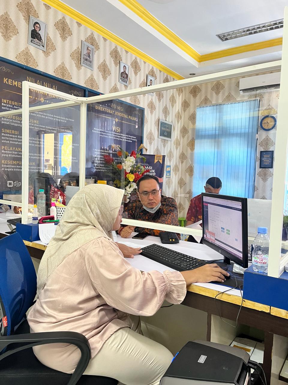 Salah seorang pengurus dari Wajib Pajak Badan mengunjungi Kantor Pelayanan, Penyuluhan, dan Konsultasi Perpajakan (KP2KP) Banawa, Sulawesi Tengah (Selasa, 6/2). Kedatangan pengurus tersebut untuk menanyakan skema perhitungan perpajakan. Pengurus tersebutmengaku masih belum memahami bagaimana cara menghitung pajak atas usahanya setelah tiga tahun menggunakan tarif Pajak Penghasilan (PPh) Final Usaha Mikro, Kecil, dan Menengah (UMKM) sebesar 0,5%, mengingat bentuk usahanya merupakan Perseroan Terbatas (PT).