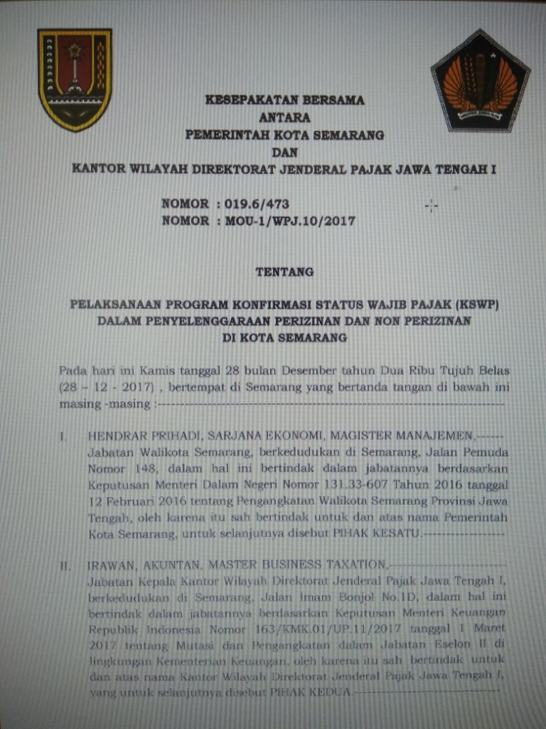 MoU antara Pemerintah Kota Semarang dengan Kanwil DJP Jawa Tengah I sebagai bentuk komitmen bersama untuk menyukseskan pelaksanaan program KSWP di Kota Semarang telah ditandatangani oleh Hendrar Priadi selaku Walikota Semarang dan Irawan selaku Kepala Kanwil DJP Jawa Tengah I (Kamis, 28/12). MoU dilakukan secara desk to desk karena sulitnya menyamakan jadwal antara keduanya, mengingat kesibukan yang sangat padat pada akhir tahun 2017.