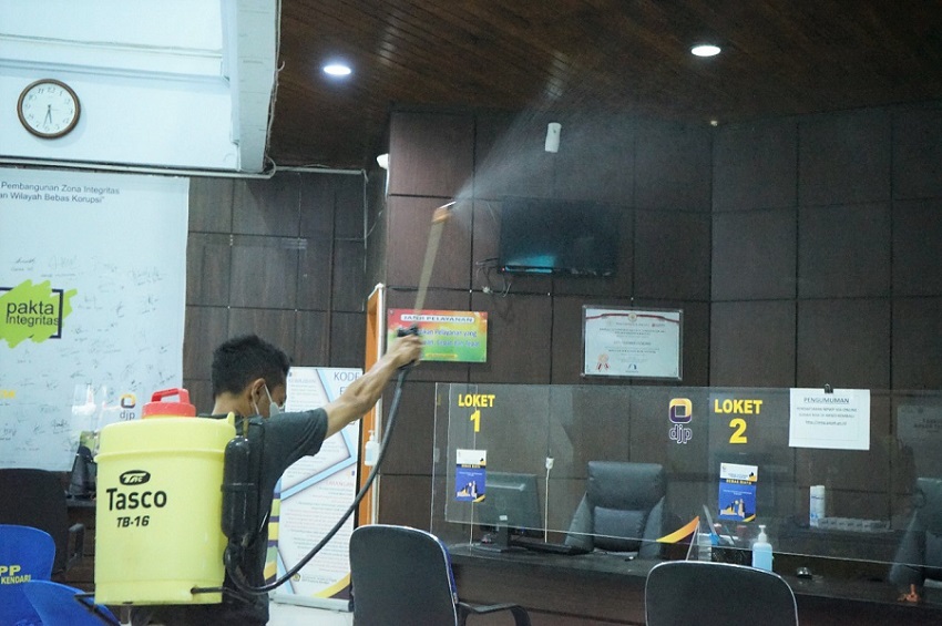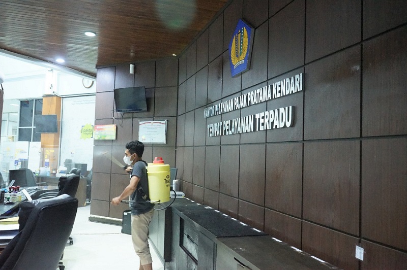 Kantor Pelayanan Pajak (KPP) Pratama Kendari melaksanakan tes cepat antigen bagi seluruh pegawai dan melakukan penyemprotan cairan disinfektan di lingkungan KPP Pratama Kendari, Kota Kendari (Selasa, 29/6).