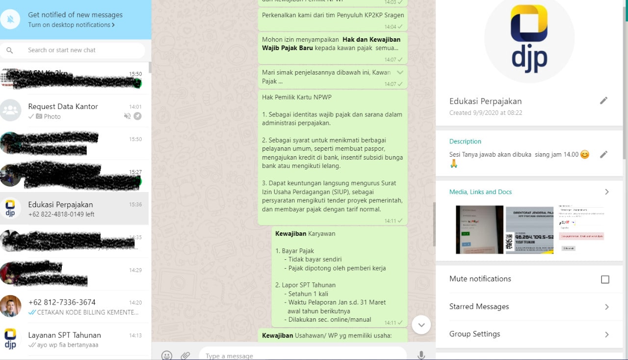 Kantor Pelayanan, Penyuluhan, dan Konsultasi Perpajakan (KP2KP) Sragen mengadakan kelas pajak daring melalui grup Whatsapp untuk wajib pajak baru di KP2KP Sragen (Jumat, 23/10).