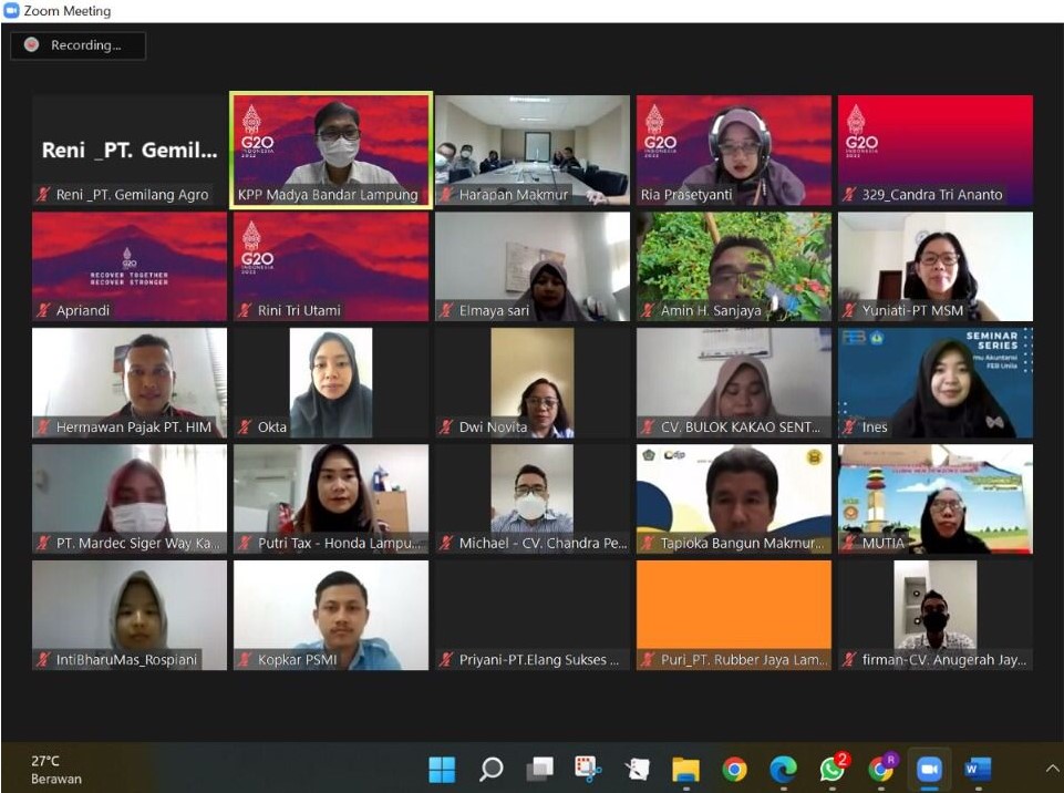 Kegiatan ini dimulai pada pukul 09.00 WIB dan berlangsung selama kurang lebih dua jam yang dilaksanakan melalui zoom meeting webinar. Ria Prsasetyanti dan Medi Kurniawan yang merupakan Penyuluh Pajak KPP Madya Bandar Lampung menjadi narasumber dalam kelas pajak ini. Diikuti oleh 35 Wajib Pajak Badan (WP Badan), kegiatan sosialisasi dibuka dengan penjelasan latar belakang kebijakan Pengurangan atau Penghapusan Sanksi Administrasi Perpajakan.