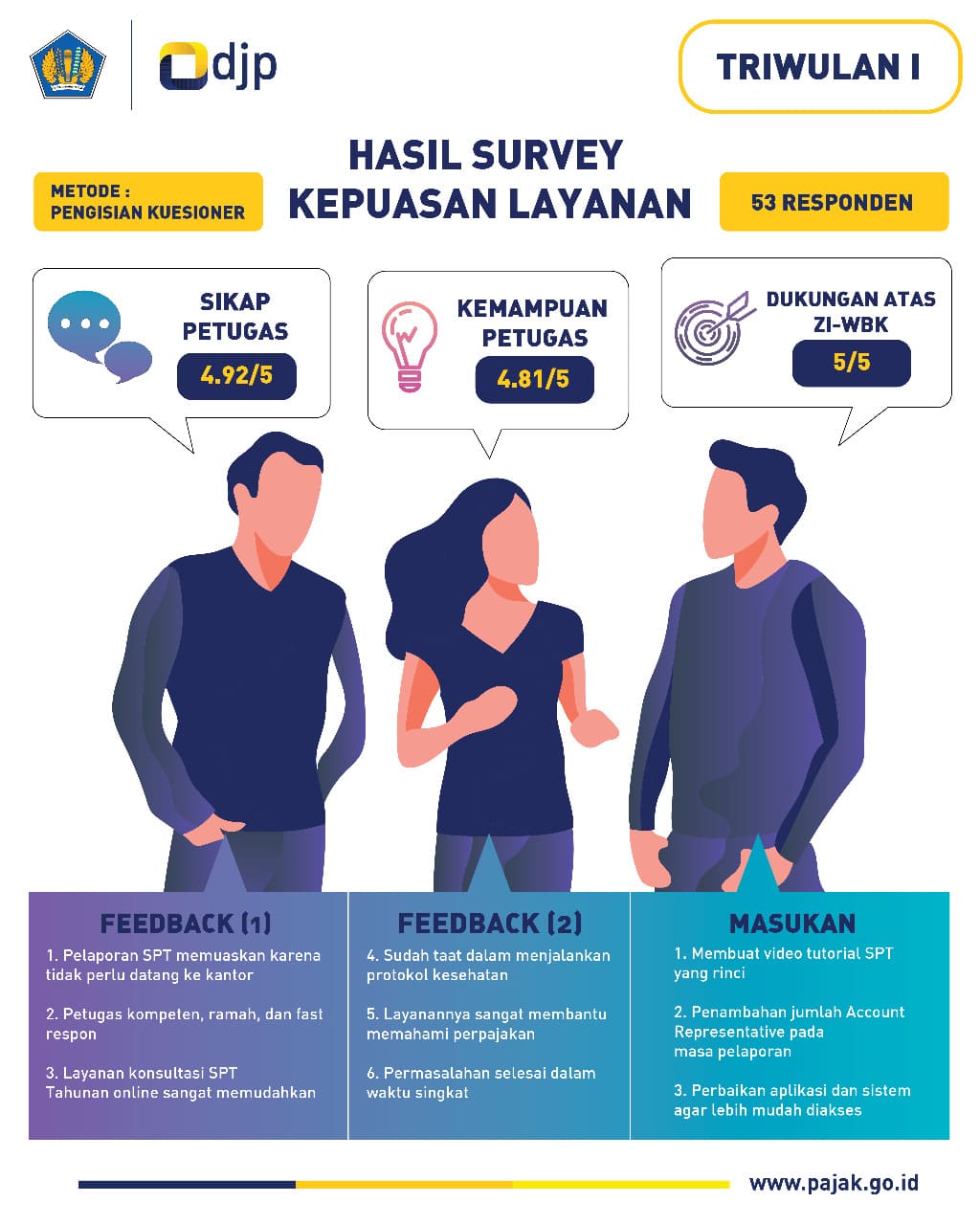 Kantor Pelayanan Pajak (KPP) Pratama Bandung Cicadas mengunggah Hasil Survei Kepuasan atas layanan yang diberikan selama Januari hingga Maret 2021 di akun media sosial Instagram, Twitter, dan Facebook resmi milik kantor @pajakcicadas di Bandung (Kamis, 22/4).