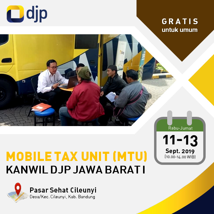 Kanwil DJP Jawa Barat I bersama KPP Pratama Majalaya menyelenggarakan layanan Mobile Tax Unit (MTU) yang berlokasi di Pasar Sehat Cileunyi, Kabupaten Bandung. Layanan ini dibuka pada hari Rabu sampai dengan Jumat tanggal 11-13 September 2019 mulai pukul 10.00-14.00 WIB . Jenis layanan yang diberikan adalah pendaftaran NPWP, Aktivasi EFIN, SPT Tahunan, dan Konsultasi. Informasi lebih lanjut dapat mengakses akun media sosial Kanwil DJP Jawa Barat I (@humasdjpjabar1)