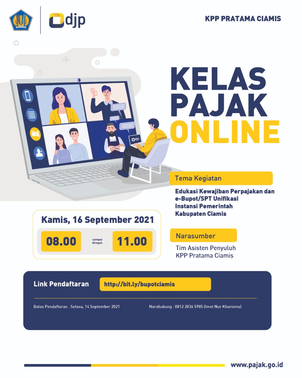 Sehubungan dengan berlakunya e-Bupot/SPT Unifikasi Instansi Pemerintah, KPP Pratama Ciamis mengundang para peserta kelas pajak perwakilan dari Isntansi Pemerintah di Kabupaten Ciamis untuk mengikuti Kelas Pajak e-Bupot/SPT Unifikasi Instansi Pemerintah yang akan diselenggarakan pada Kamis, 16 September 2021 pukul 08.00 s.d 11.00 WIB melalui zoom meeting. Info lebih lanjut dapat menghubungi WA chat ke nomor 081220365985.