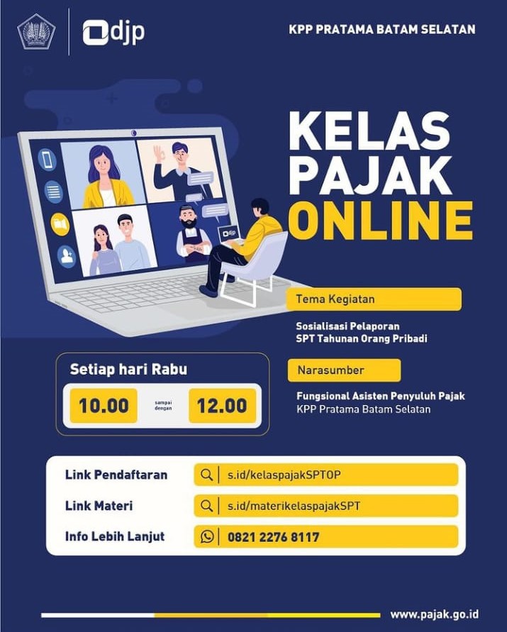 KPP Pratama Batam Selatan membuka kelas pajak online setiap hari Rabu jam 10.00 s.d. 12.00 WIB dengan narasumber Fungsional Penyuluh Pajak. Link pendaftaran: s.id/kelaspajakSPTOP info lebih lanjut: 0821 2276 8117 Image 50 kali dilihat