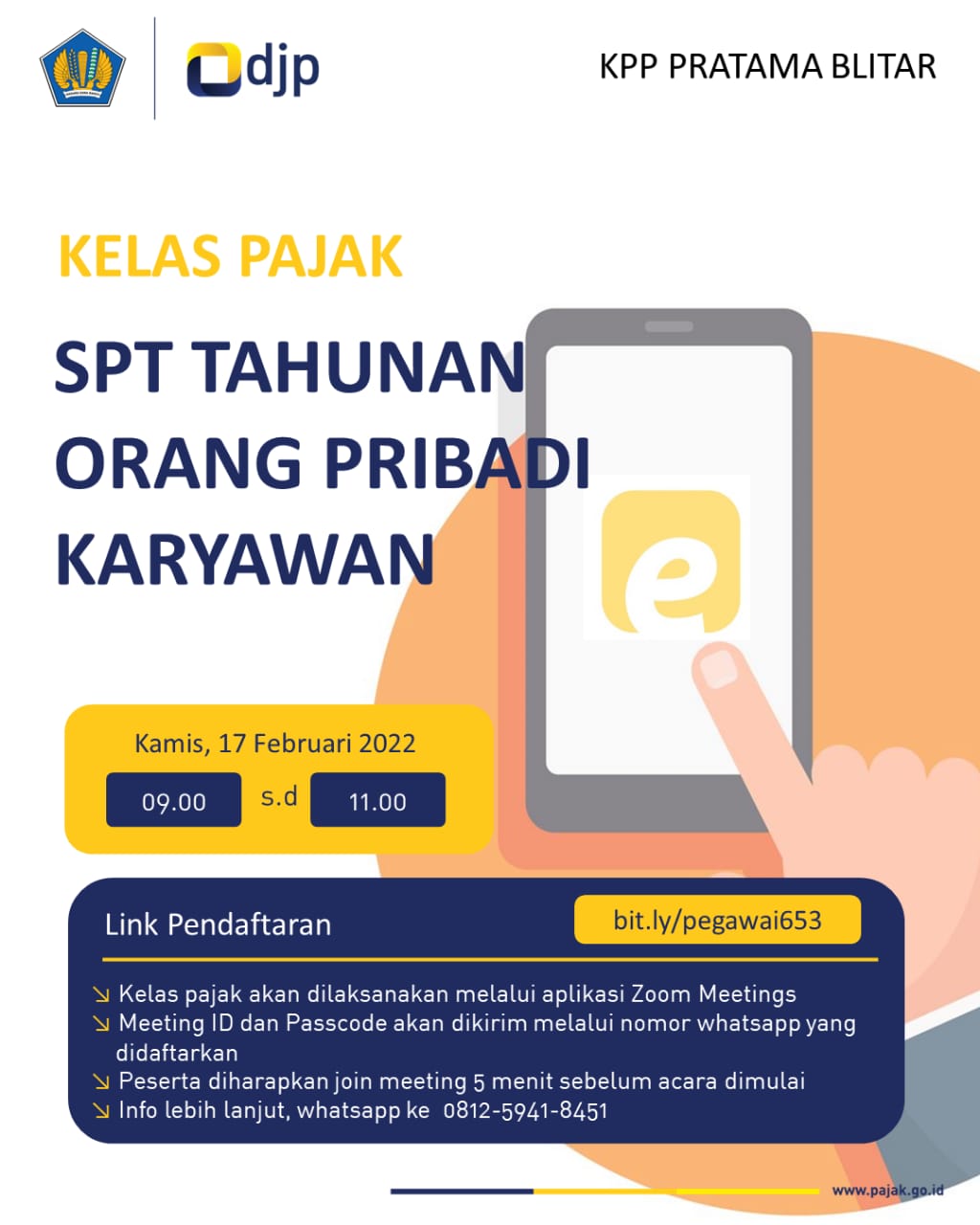 Kantor Pelayanan Pajak (KPP) Pratama Blitar akan mengadakan kelas pajak secara daring terkait tata cara penyampaian Surat Pemberitahuan (SPT) Tahunan bagi orang pribadi karyawan. Kelas pajak akan diselenggarakan pada Kamis, 17 Februari 2022 melalui aplikasi zoom clouds meeting. Bagi wajib pajak yang berminat mengikuti kelas tersebut dapat mendaftarkan diri pada bit.ly/pegawai653 .