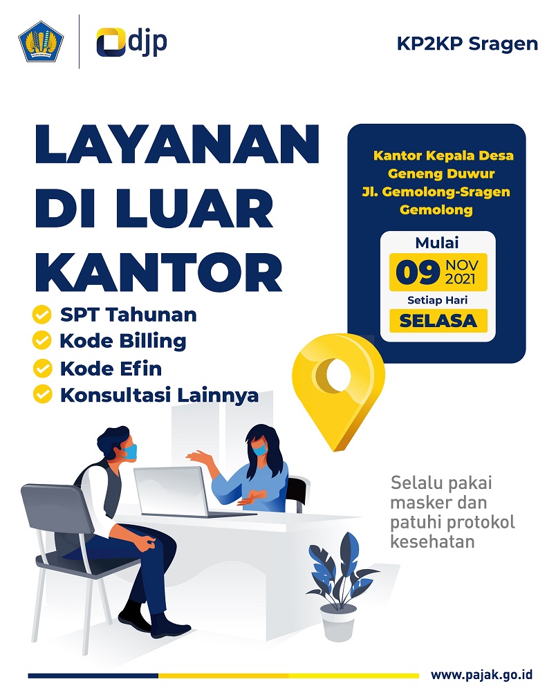 KP2KP Sragen membuka Layanan di Luar Kantor di Kantor Kepala Desa Geneng Duwur, Gemolong. Layanan di Luar Kantor akan dimulai 9 November 2021 setiap hari Selasa pukul 09.00 WIB sampai dengan 14.00 WIB. Kawan Pajak dapat memperoleh layanan perpajakan antara lain, Laporan SPT Tahunan, Cetak Kode EFIN, Cetak Kode Billing dan Konsultasi Perpajakan Lainnya.