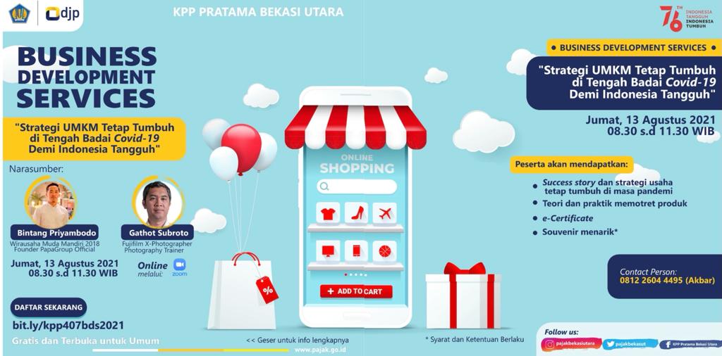 KPP Pratama Bekasi Utara akan mengadakan kegiatan Business Development Services (BDS) bagi para pelaku UMKM. BDS dengan tema “Strategi UMKM Tetap Tumbuh di Tengah Badai Covid-19 Demi Indonesia Tangguh” ini mendatangkan dua narasumber yaitu Bintang Priyambodo Founder Papa Group Official dan Gathot Subroto Photography Trainer.