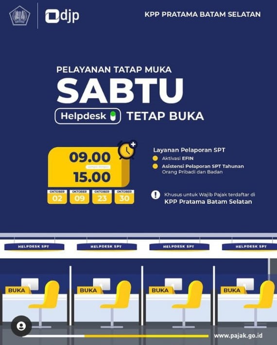 Khusus untuk #KawanPajak yang terdaftar di KPP Pratama Batam Selatan yang ingin mencetak EFIN dan membutuhkan panduan untuk melaporkan SPT Tahunan, Kami siap melayani #KawanPajak di hari sabtu juga loh!