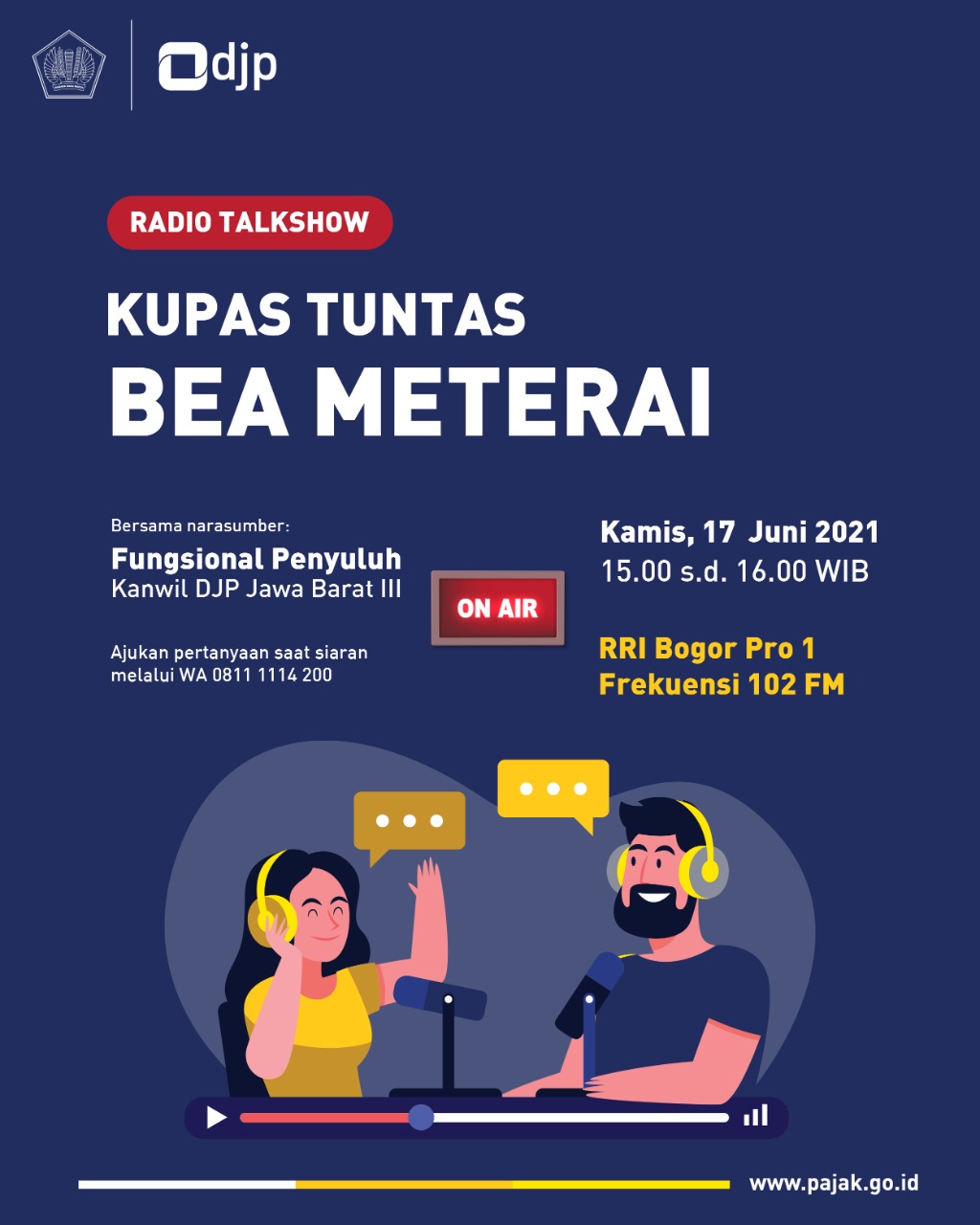 Kanwil DJP Jawa Barat III akan menyampaikan sosialisasi terkait Bea Meterai melalui gelar wicara radio di Radio Republik Indonesia Bogor (@rri_bogor) Pro 1 FM 102 pada :