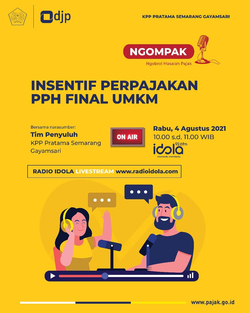 Jangan lewatkan Gelar Wicara KPP Pratama Semarang Gayamsari "Ngompak, Ngobrol Masalah Pajak" bersama Radio Idola Semarang 92.6 FM pada: