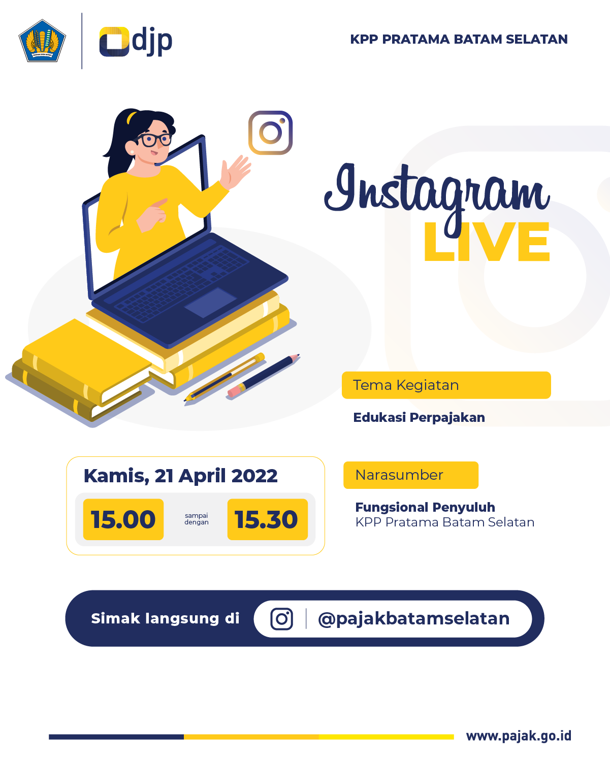 Bagi #KawanPajak yang ingin belajar tentang Perpajakan bisa ikuti live instagram kami Kamis, tanggal 21 April pukul 15.00 WIB yaa👋