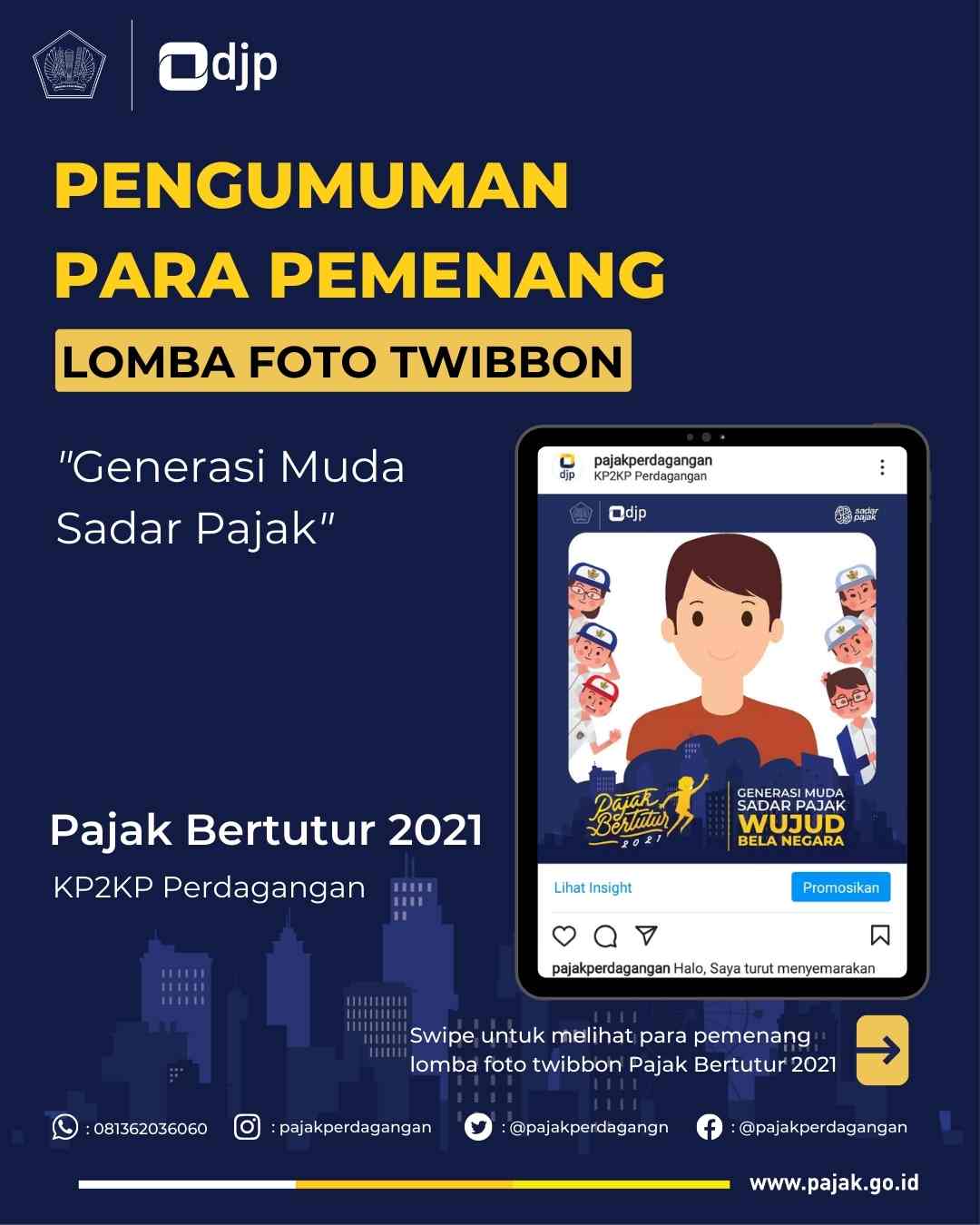 Kantor Pelayanan, Penyuluhan, dan Konsultasi Perpajakan (KP2KP) Perdagangan telah mengadakan Lomba Foto Twibbon Pajak Bertutur 2021 dengan tema Pajak Bertutur 2021 atau Pendidikan. Foto Twibbon harus diunggah pada akun sosial media Instagram dengan fototrg menarik dan caption yang terbaik.