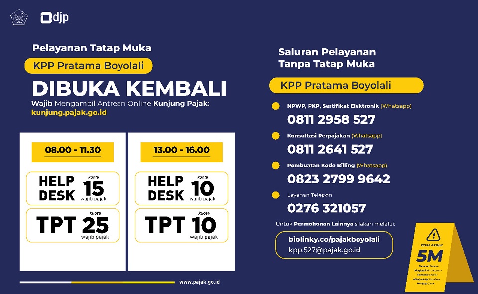Untuk peningkatan pelayanan kepada masyarakat Boyolali terutama di masa pandemi covid-19, KPP Pratama Boyolali melakukan perubahan nomor layanan telepon SMS/WhatsApp.