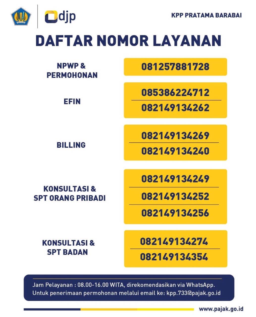Untuk mempermudah layanan wajib pajak yang terdaftar di KPP Pratama Barabai, wajib pajak dapat menghubungi nomor whatsapp melalui chat pada nomor berikut