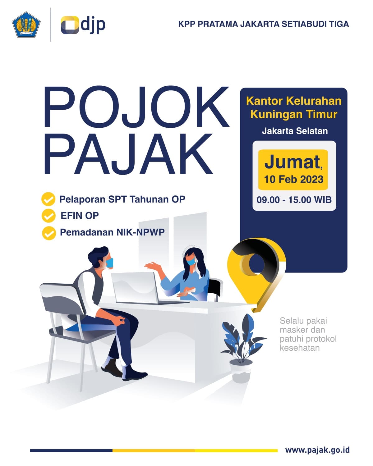 KPP Pratama Jakarta Setiabudi Tiga mengadakan Pojok Pajak di Kantor Kelurahan Kuningan Timur - Kecamatan Setiabudi - Jakarta Selatan pada tanggal 10 Februari 2023 Pukul 09.00 - 15.00. Layanan yang diberikan berupa Pelaporan SPT Tahunan Orang Pribadi, Pelayanan Aktivasi EFIN dan Pemadanan NIK sebagai NPWP.