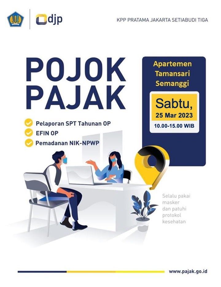 Pojok Pajak hadir di Apartemen Tamansari Semanggi hari Sabtu 25 Maret 2023. pukul 10.00 sampai dengan 15.00 WIB.