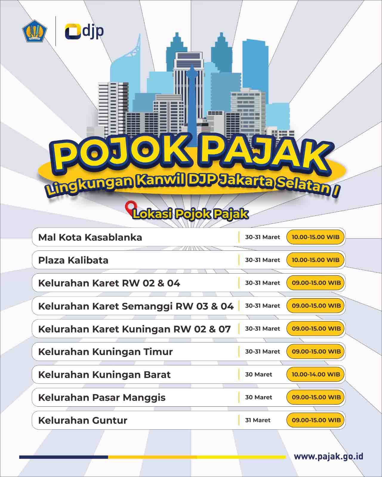 Kantor Pelayanan Pajak (KPP) di Lingkungan Kanwil DJP Jakarta Selatan I akan membuka pojok pajak dengan layanan asistensi pelaporan SPT Tahunan dan Pemadanan NIK-NPWP, dengan jam layanan sebagaimana terlampir.