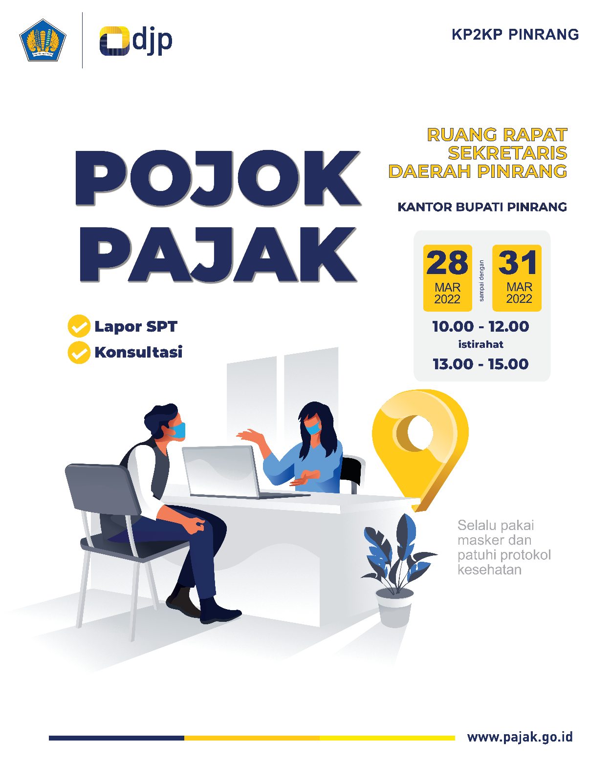 Bagi #kawanpajak khususnya para ASN di lingkungan Pemerintah Daerah Kabupaten Pinrang yang belum melaporkan SPT Tahunannya, yuk bisa banget datang ke Pojok Pajak di Ruang Rapat Sekretariat Daerah Kabupaten Pinrang Kantor Bupati Pinrang. Pelayanan Pojok Pajak masih tersedia hingga hari terakhir batas pelaporan 31 Maret 2022.