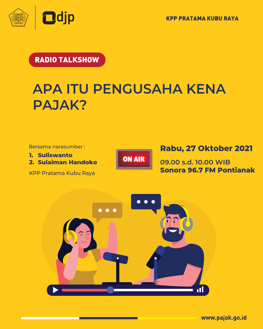 KPP Pratama Kubu Raya mengadakan talkshow radio dengan tema Kupas Tuntas Pengusaha Kena Pajak (PKP) bekerjasama dengan Radio Sonora (96,7 FM) Kota Pontianak. Kegiatan dilaksanakan hari Rabu, 27 Oktober 2021 pukul 09.00-10.00 WIB.