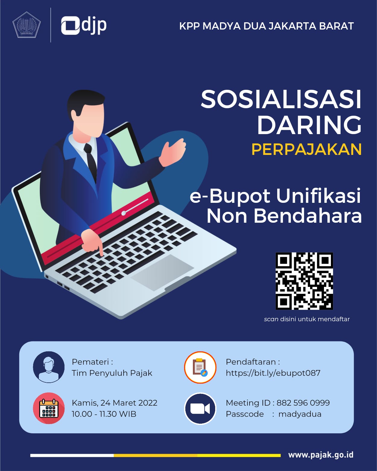 Bagi kamu #KawanPajak yang terdaftar pada KPP Madya Dua Jakarta Barat dan ingin mengetahui lebih lanjut terkait e-Bupot Unifikasi, KPP Madya Dua Jakarta Barat akan mengadakan Sosialisasi e-Bupot Unifikasi Non Bendahara yang akan dilaksanakan secara daring pada Kamis, 24 Maret 2022. Informasi lebih lanjut, silakan dilihat pada poster diatas ya...