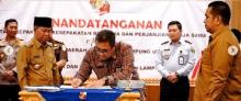 Lampung, 3 April 2023 - Kepala Kanwil DJP Bengkulu dan Lampung Tri Bowo dan Bupati Lampung Utara Budi Utomo menandatangani Perjanjian Kerjasama Penyelenggaraan Pelayanan Perpajakan di Mal Pelayanan Publik (MPP) Kabupaten Lampung Utara. Penandatanganan ini didampingi dan disaksikan oleh Kepala Bidang Penyuluhan Pelayanan dan Hubungan Masyarakat Sugiri Tejanagara dan Kepala Kantor Pelayanan Pajak (KPP) Pratama Kotabumi Nurdin Edwin.
