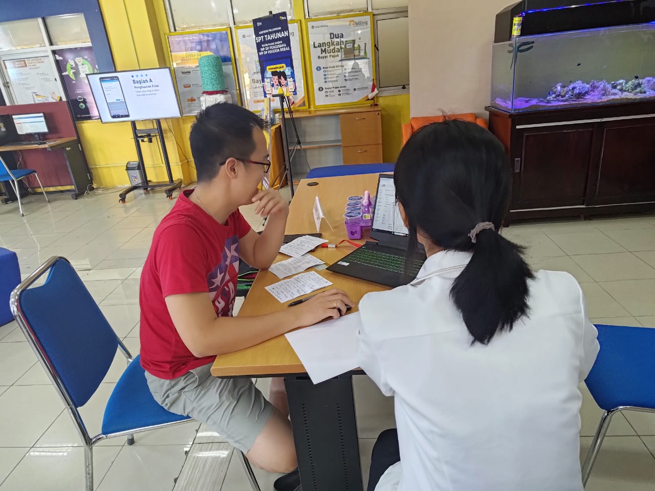 Seorang wajib pajak mendatangi Kantor Pelayanan Pajak (KPP) Pratama Tolitoli untuk berkonsultasi terkait aplikasi e-Faktur (Senin, 26/2). Wajib pajak tersebut mengalami kendala pada saat akan mengajukan permohonan Nomor Seri Faktur Pajak (NSFP) melalui website e-Nofa.