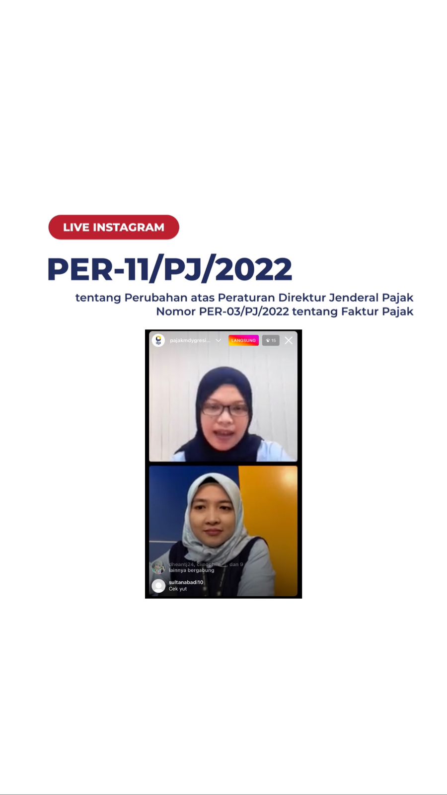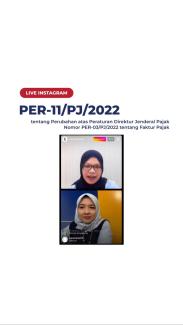 “Halo kawan pajak, jumpa lagi pada acara Tax Live Episode 9. Selama satu jam ke depan, bersama rekan saya Zakiah, kami berdua akan membahas lebih mendalam terkait berlakunya Peraturan Direktur Jenderal Pajak Nomor PER-11/PJ/2022 perubahan atas PER-03/PJ/2022 tentang Faktur Pajak,” sapa Rizqi Fitriana di ruang podcast dalam siaran langsung via Instagram KPP Madya Gresik (Rabu, 21/9).