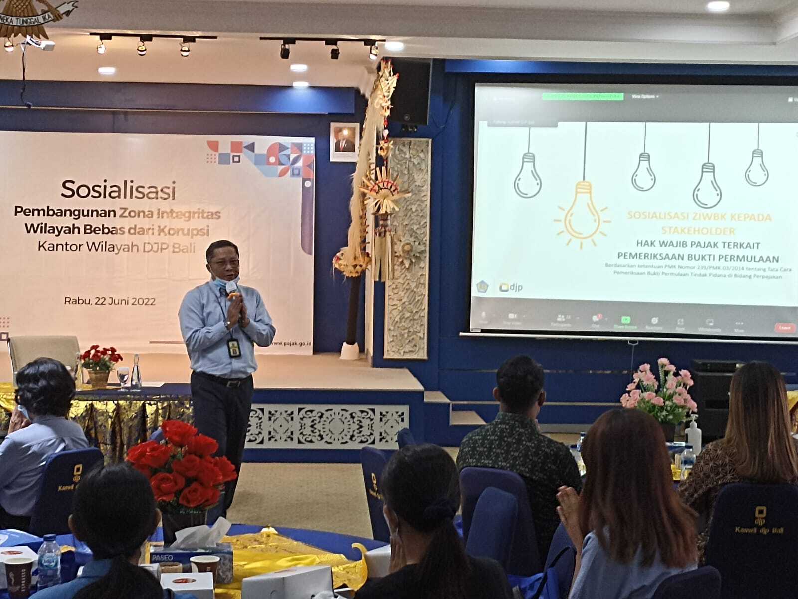 Dalam rangka pembangunan Zona Integritas menuju Wilayah Bebas dari Korupsi (ZIWBK), Kantor Wilayah Direktorat Jenderal Pajak (Kanwil DJP) Bali mengadakan kegiatan sosialisasi Pembangunan Wilayah Bebas dari Korupsi (WBK) sekaligus sosialisasi tentang hak wajib pajak saat dilakukan pemeriksaan Bukti Permulaan (Bukper) di Aula Kanwil DJP Bali (Rabu, 22/06).