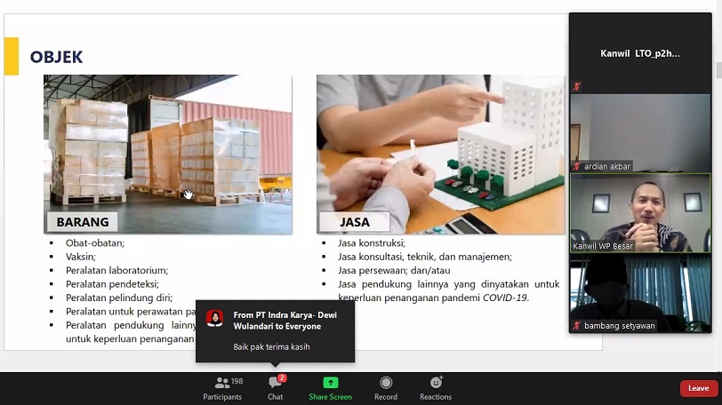 Kanwil DJP Wajib Pajak Besar bekerja sama dengan KPP Wajib Pajak Besar Satu kembali mengadakan kelas pajak daring melalui aplikasi telekonferensi yang diikuti oleh 100 wajib pajak terdaftar di lingkungan Kanwil DJP Wajib Pajak Besar (Kamis, 14/5). Tema kegiatan Sosialisasi adalah PMK Nomor 28/PMK.03/2020 tentang Pemberian Fasilitas Pajak terhadap Barang dan Jasa yang Diperlukan dalam Rangka Menangani Pandemi Covid-19.