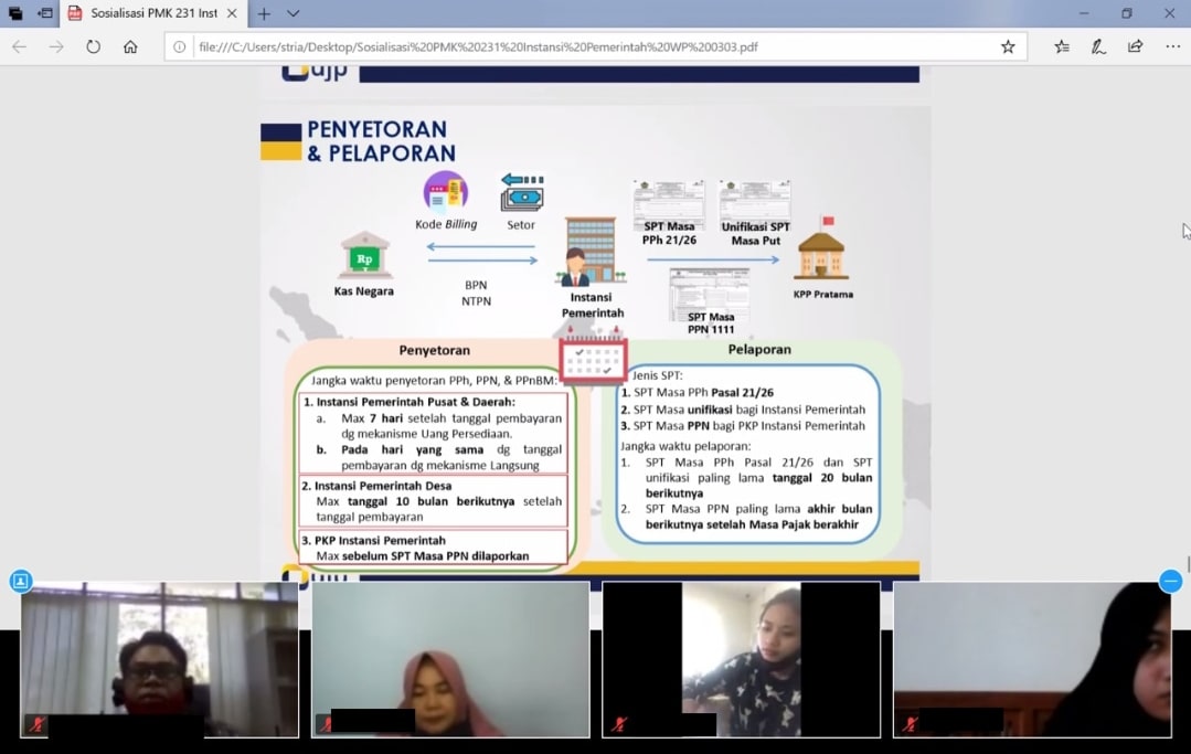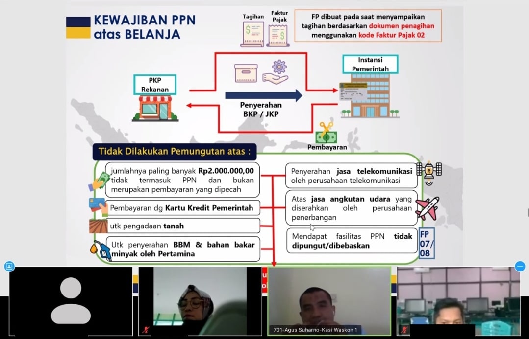 KPP Pratama Pontianak Barat kembali mengadakan sosialisasi aturan baru mengenai NPWP bagi Instansi Pemerintah secara daring di ruang rapat KPP Pratama Pontianak Barat (Jumat, 03/07). Sosialisasi ini diikuti oleh 15 bendahara yang berasal dari berbagai macam Instansi Pemerintah Daerah di Kota Pontianak.
