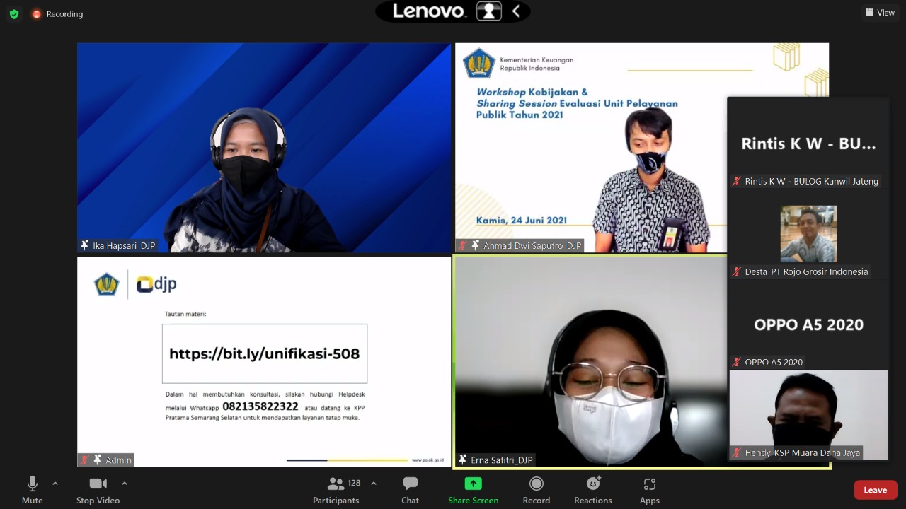 Sebanyak 150 perwakilan Wajib Pajak Badan mengikuti bimbingan teknis (bimtek) implementasi Bukti Pemotongan Elektronik (e-Bupot) dan Surat Pemberitahuan (SPT) Masa Unifikasi yang diselenggarakan oleh Kantor Pelayanan Pajak (KPP) Pratama Semarang Selatan (Jumat, 13/5). Kegiatan dilaksanakan secara daring melalui aplikasi Zoom Meeting dari Aula KPP Pratama Semarang Selatan, Semarang.