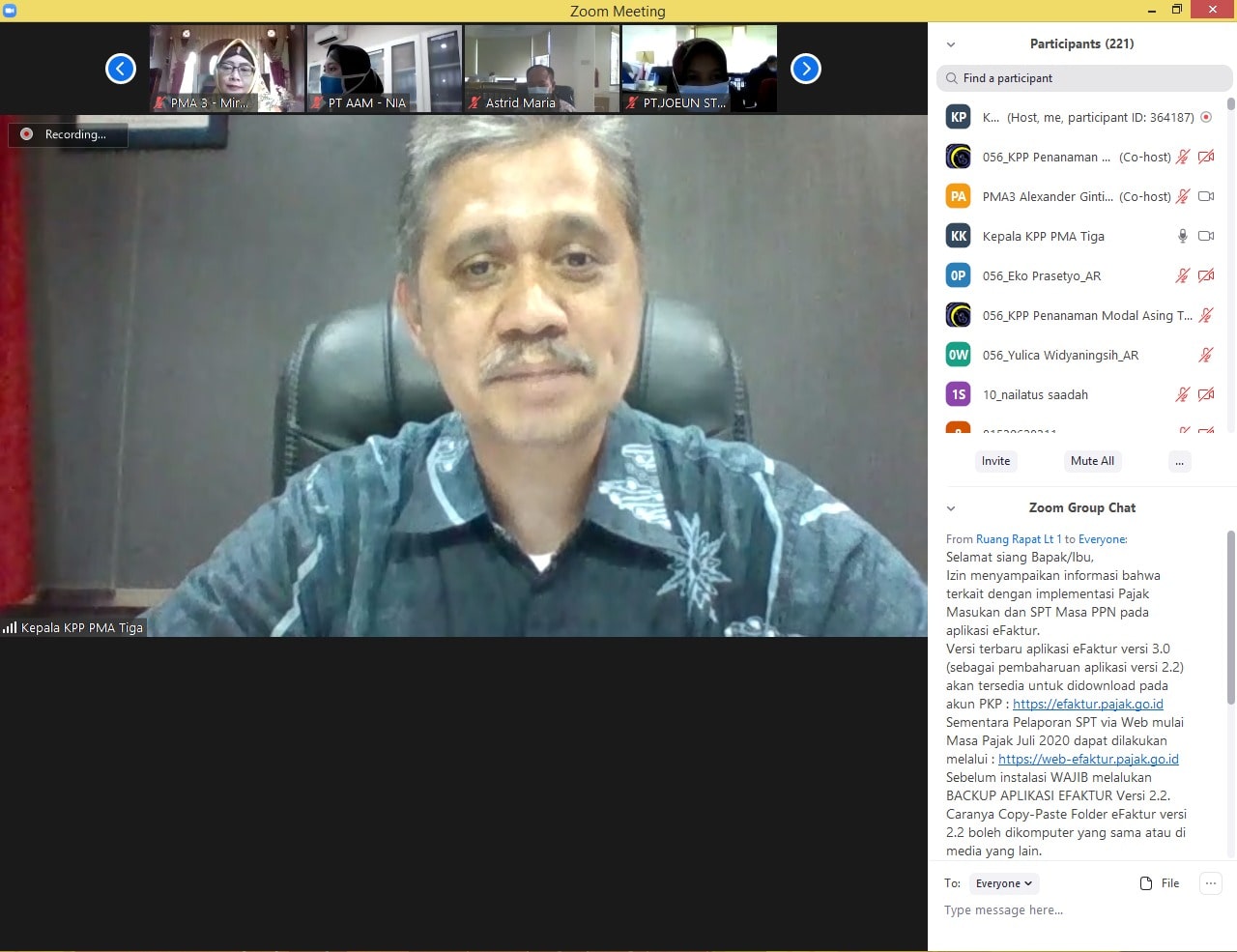 Kantor Pelayanan Pajak (KPP) Penanaman Modal Asing Tiga (KPP PMA Tiga) memberikan pelayanan prima kepada wajib pajak dengan menyelenggarakan edukasi aplikasi e-Faktur 3.0 secara daring melalui aplikasi telekonferensi Zoom Meeting di Jakarta (Selasa, 22/9). Kegiatan edukasi ini dikuti oleh 170 wajib pajak yang telah melakukan registrasi sebelumnya