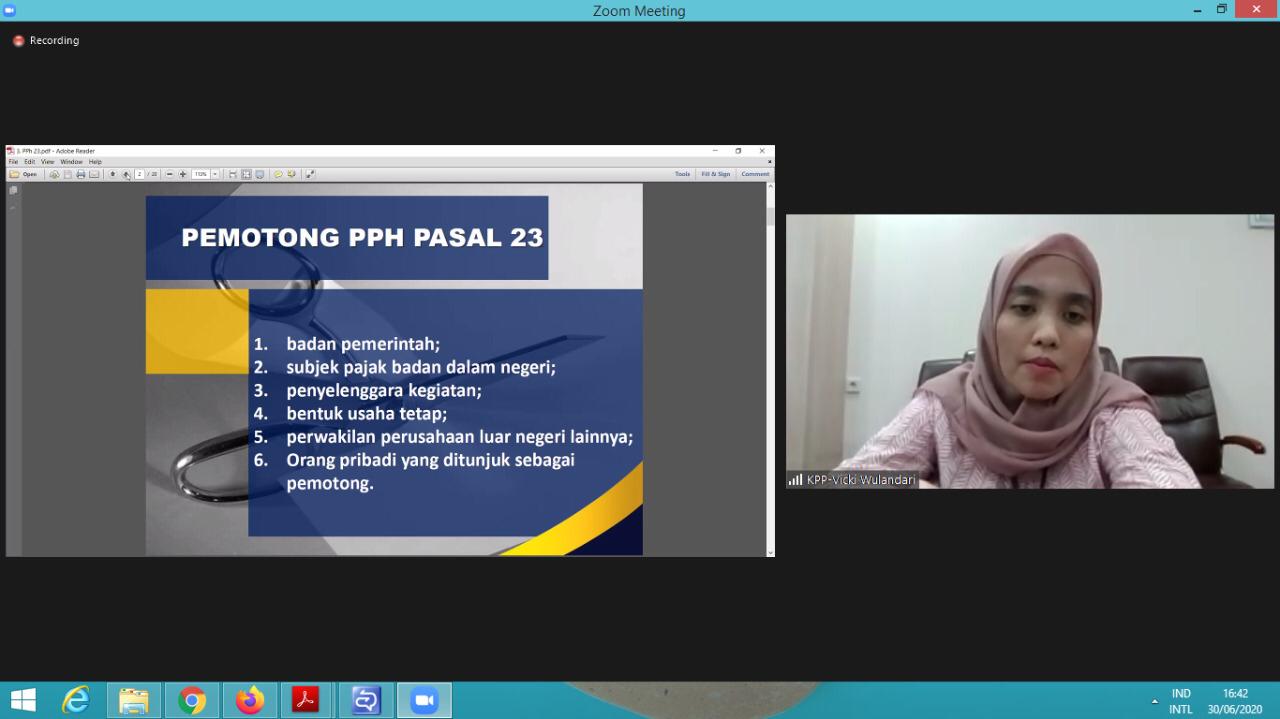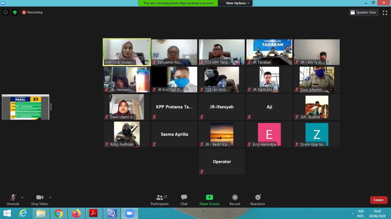 Kantor Pelayanan Pajak Pratama Tarakan (KPP Pratama Tarakan) menyelenggarakan kegiatan edukasi pajak yang diikuti oleh 18 peserta dari Kantor Jasa Raharja Cabang Kalimantan Timur dan Kantor Jasa Raharja Perwakilan Tarakan melalui aplikasi Zoom Meeting yang dilangsungkan di KPP Pratama Tarakan (Selasa, 30/06).