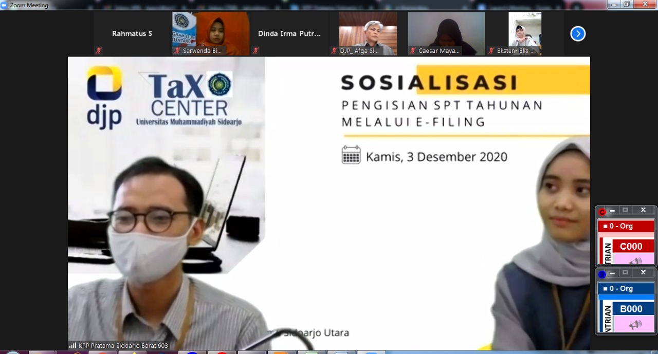 Kantor Pelayanan Pajak (KPP) Pratama Sidoarjo Barat, KPP Pratama Sidoarjo Selatan, dan KPP Pratama Sidoarjo Utara bekerja sama dengan Tax Center Universitas Muhammadiyah Sidoarjo mengadakan Bimbingan Teknis Pengisian SPT Tahunan PPh melalui video telekonferensi Zoom Meetings di Kabupaten Sidoarjo (Kamis, 3/12). Kegiatan ini dihadiri oleh Kepala Kantor dan Kepala Seksi Ekstensifikasi dan Penyuluhan masing-masing KPP, Ketua Tax Center Universitas Muhammadiyah Sidoarjo, serta anggota Duta Pajak yang berjumlah 20 orang.