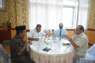 Kepala KPP Pratama Tobelo Helmy Afrul berbincang sejenak dengan Ketua DPRD Kabupaten Halmahera Utara Yulius Dagilaha sebelum memulai acara. Helmy menjelaskan terkait rangkaian kegiatan KPP Pratama Tobelo untuk meningkatkan kepatuhan Wajib Pajak salah satunya yaitu asistensi SPT Tahunan di Kantor DPRD Kabupaten Halmahera Utara.