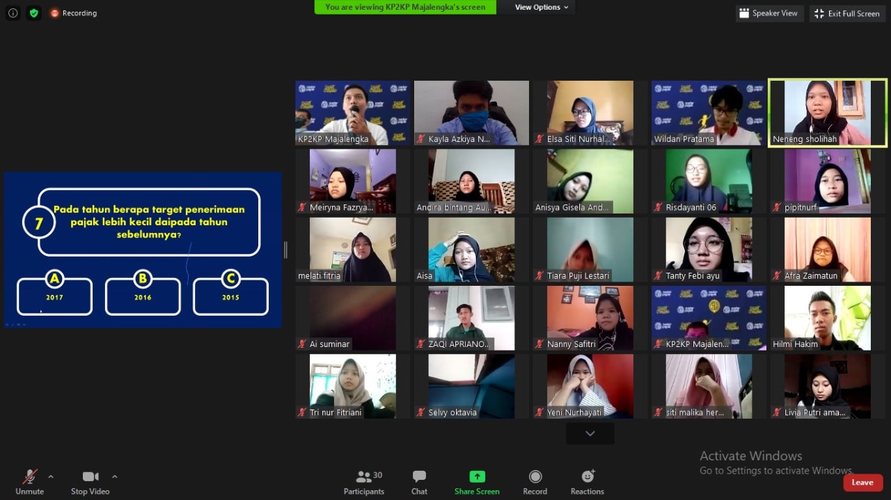 KPP Mikro Majalengka menyelenggarakan acara Pajak Bertutur melalui media Zoom di KPP Mikro Majalengka (Rabu, 15/7). Sejumlah 27 siswa SMK Negeri 1 Kadipaten mengikuti kegiatan yang merupakan rangkaian peringatan Hari Pajak yang jatuh pada tanggal 14 Juli.