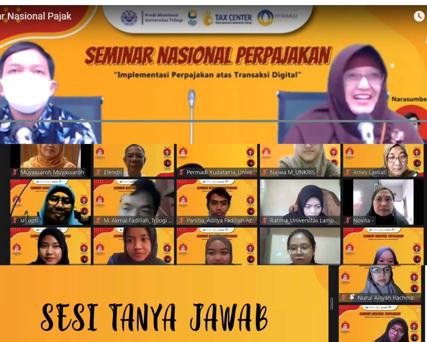 Fungsional Penyuluh Kantor Wilayah Direktorat Jenderal Pajak (Kanwil DJP) Jakarta Selatan I menjadi narasumber pada Seminar Nasional Perpajakan yang dilaksanakan secara daring oleh Universitas Trilogi di Jakarta (Jumat, 20/8). Mengusung tema Implementasi Perpajakan atas Transaksi Digital, kegiatan ini diikuti oleh sekitar 288 siswa dan mahasiswa yang berasal dari berbagai universitas/sekolah di Indonesia.