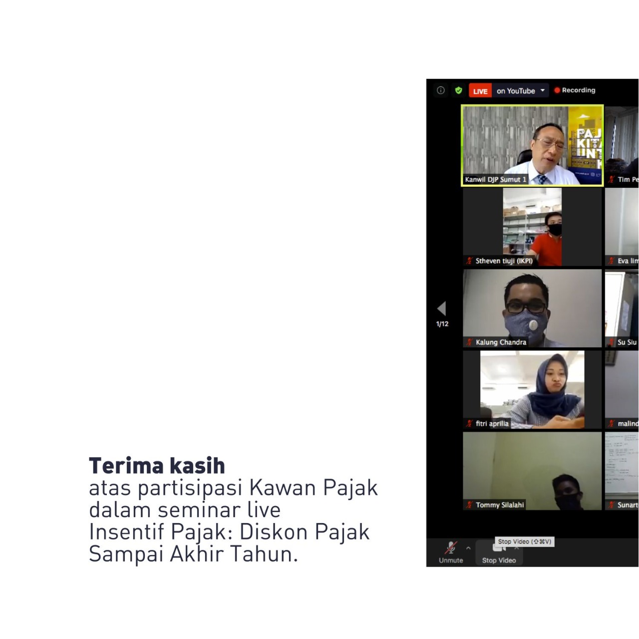 Plt. Kepala Kantor Wilayah DJP Sumatera Utara I membuka seminar perpajakan yang diselenggarakan berkat kerja sama Ikatan Konsultan Pajak Indonesia (IKPI) Sumatera Utara. Seminar yang bertema Diskon Pajak Sampai Akhir Tahun ini diikuti sebanyak 290 wajib pajak. Sekretaris Pengurus Daerah IKPI Sumatera Utara Drs. H Syaflul dan Ketua IKPI Medan Barry Kusuma turut menyampaikan sambutan dalam webinar kali ini.